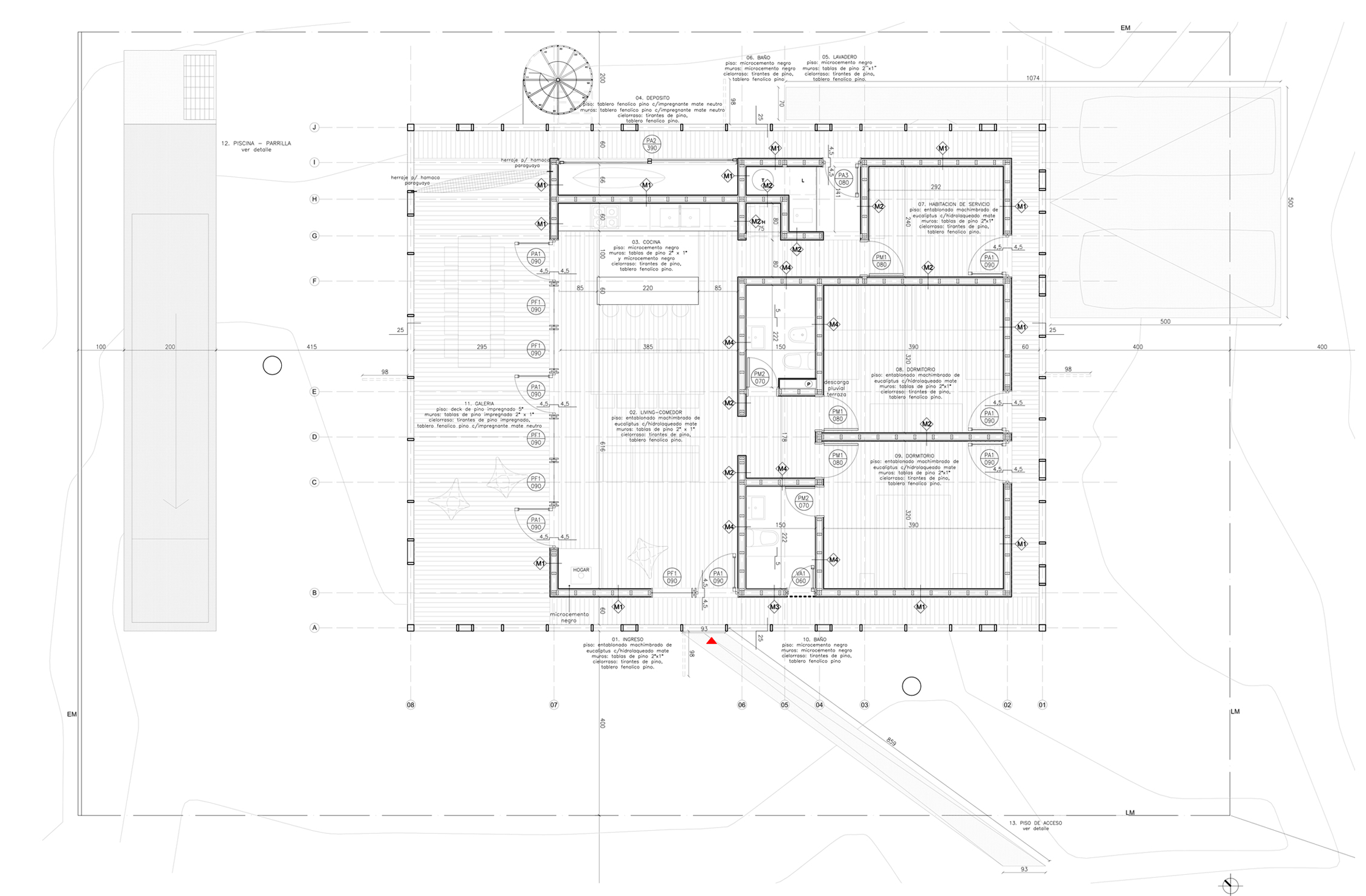 This holiday house sits in a small corner lot of the coastal town of Manantiales (Uruguay), a few blocks away from the ocean. Two big existing pines -to be maintained- define the placement options for the project in plan, while the treetops reduce the aerial space.