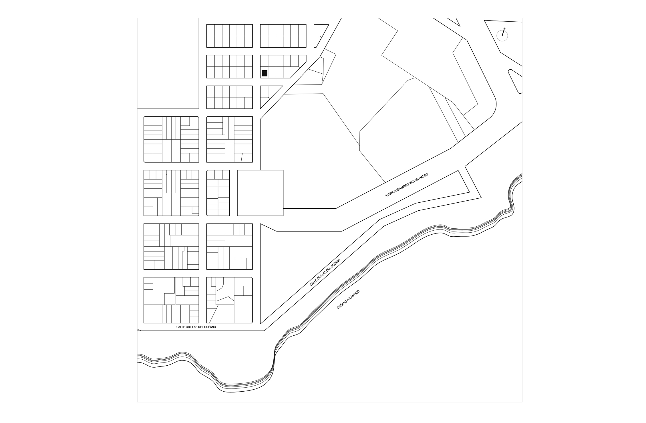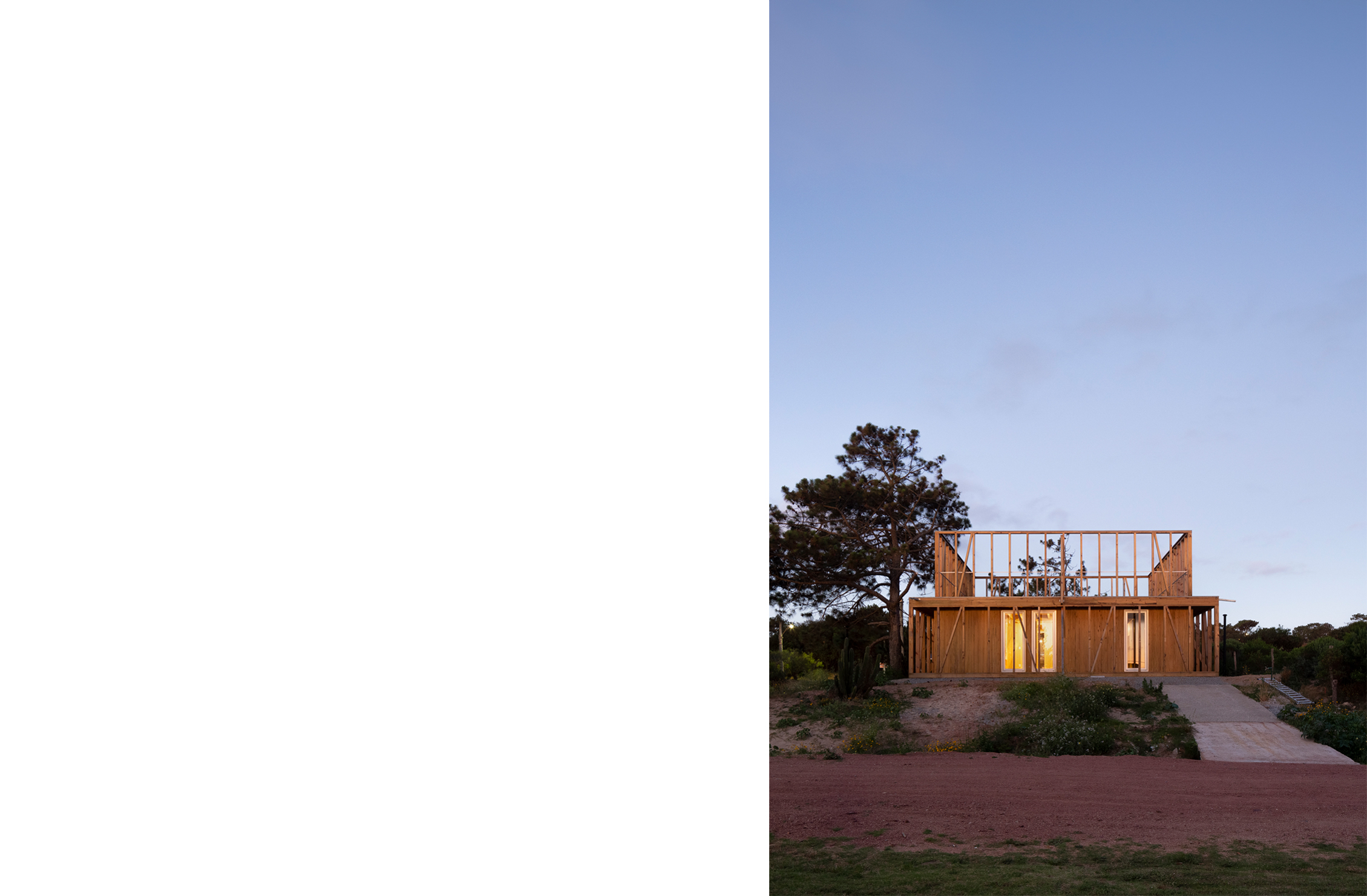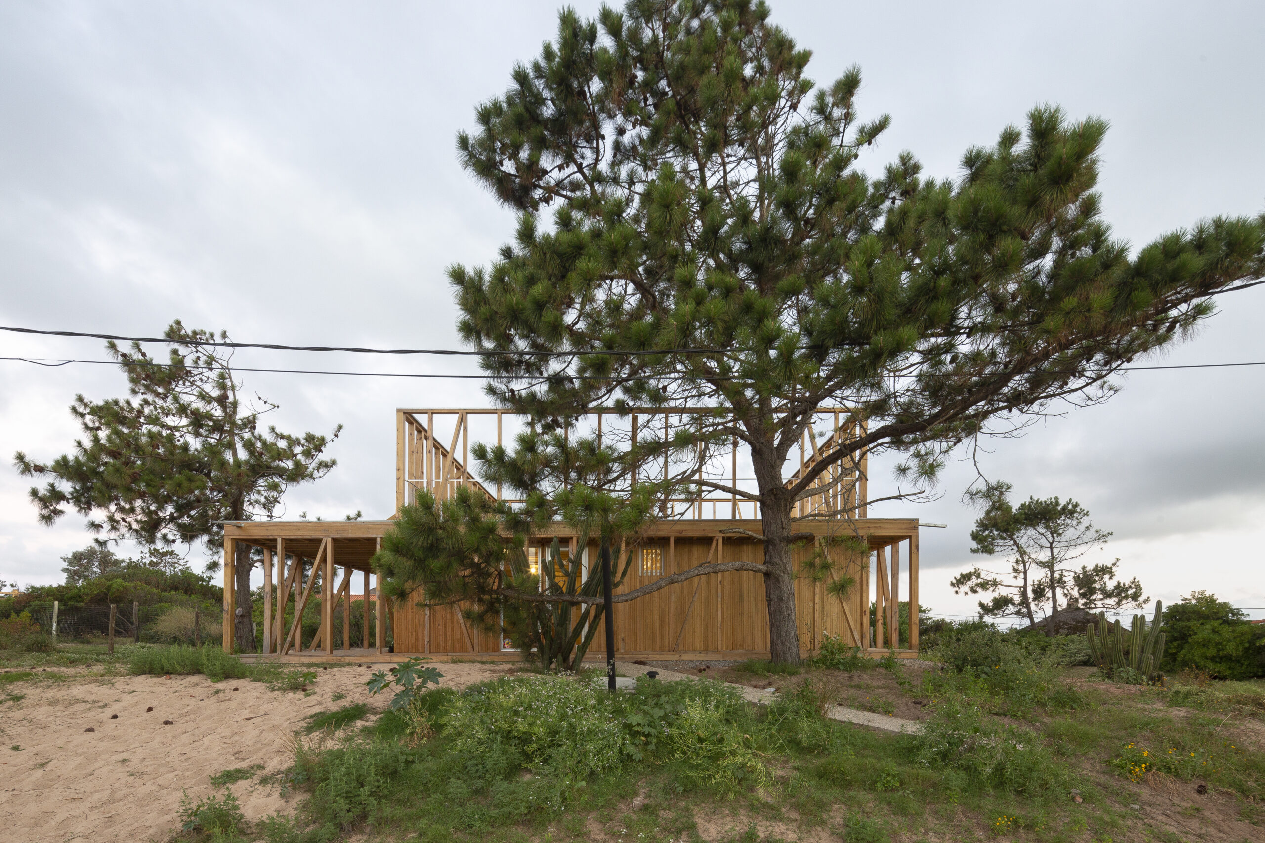 En una pequeña esquina del pueblo costero de Manantiales (Uruguay), se ubica esta casa de temporada, a pocas cuadras del mar. Dos grandes pinos existentes que se deciden respetar definen las opciones de emplazamiento, y reducen con sus copas el espacio aéreo disponible.