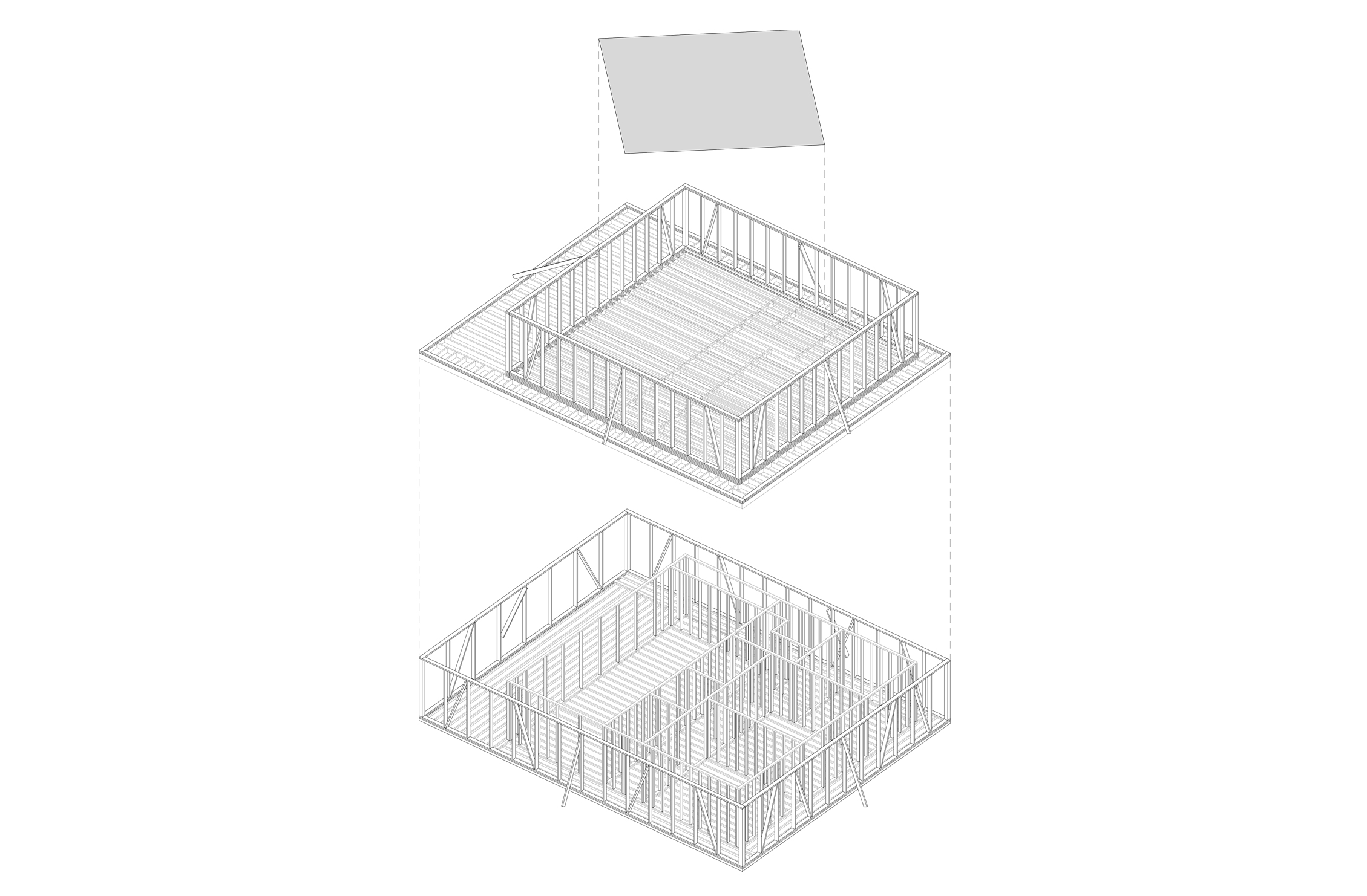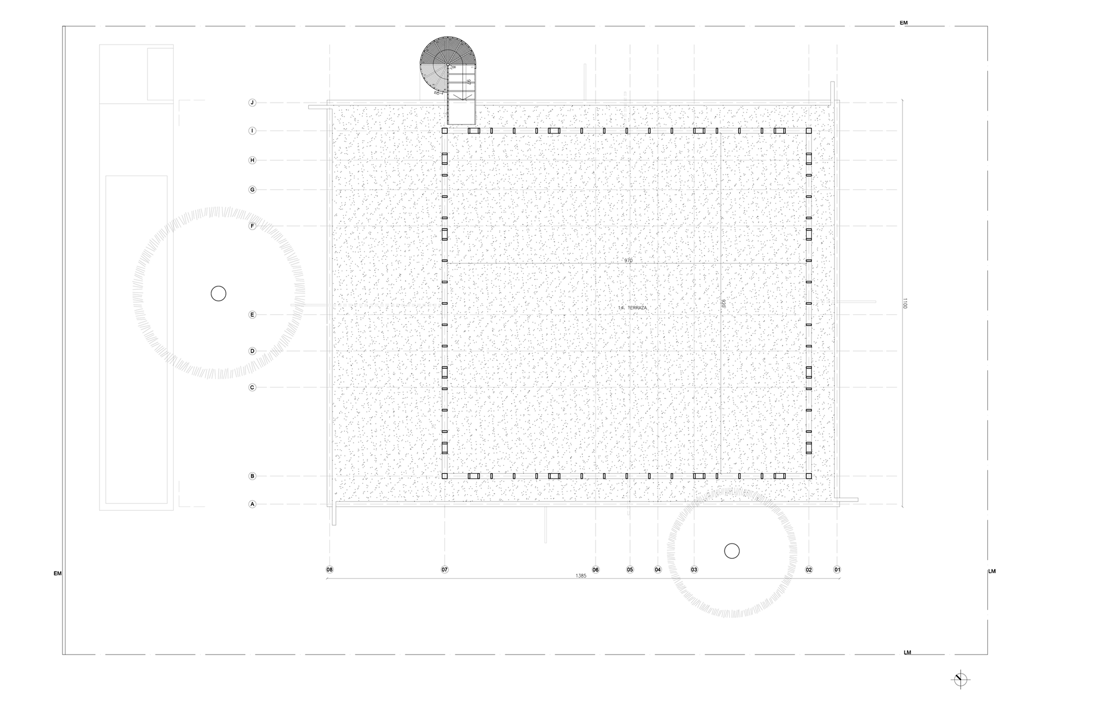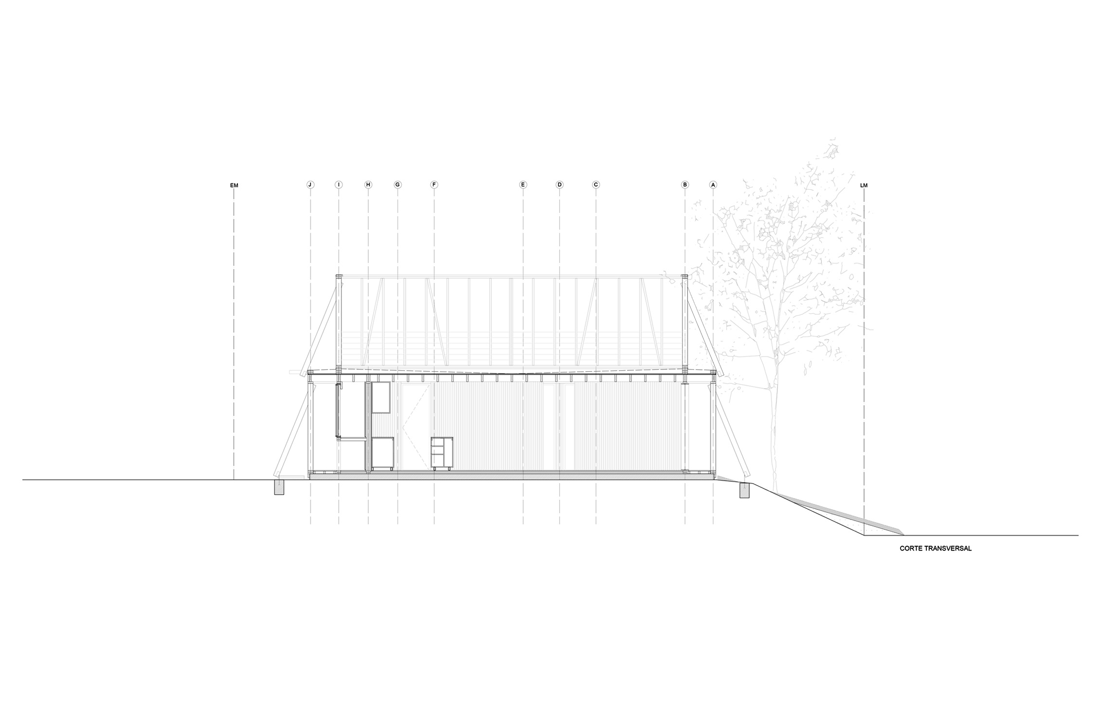 Esta segunda planta se achica en su pisada hasta coincidir con el perímetro cerrado de la planta baja para utilizar su estructura de soporte y no interferir con las copas de los pinos existentes en el lugar.