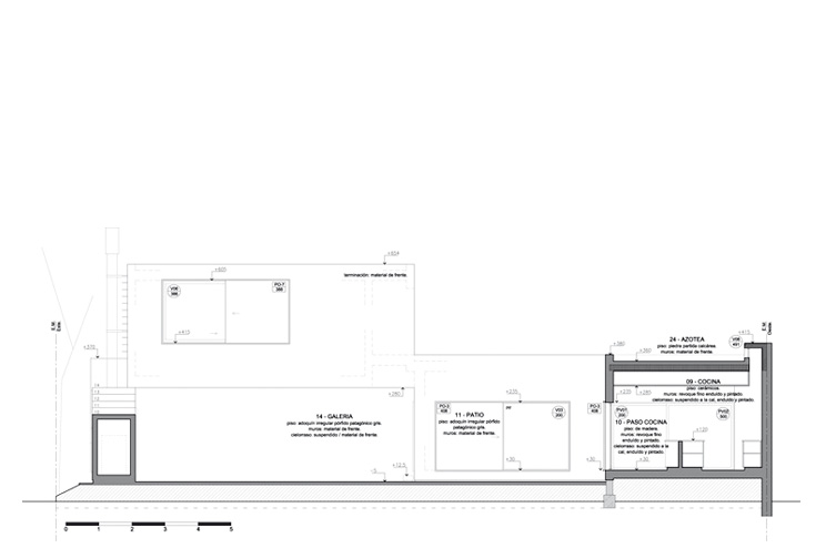 Interiormente, las distintas áreas domésticas y su circulación se desarrollan en forma lineal alrededor del patio. Las aberturas recorren todo el perímetro de la casa según las necesidades del programa y en ocasiones se alienan para obtener vistas continuas hacia el jardín. Paneles móviles de cerramiento de mutilaminado fenólico dotan a la casa de oscurecimiento y seguridad. De acuerdo a la posición de estos paneles, el carácter de la casa varía continuamente. Se ha utilizado un revoque monocapa elástico, continuo, blanco y con textura, de leve tinte verdoso, que unifica todas las superficies interiores y exteriores.