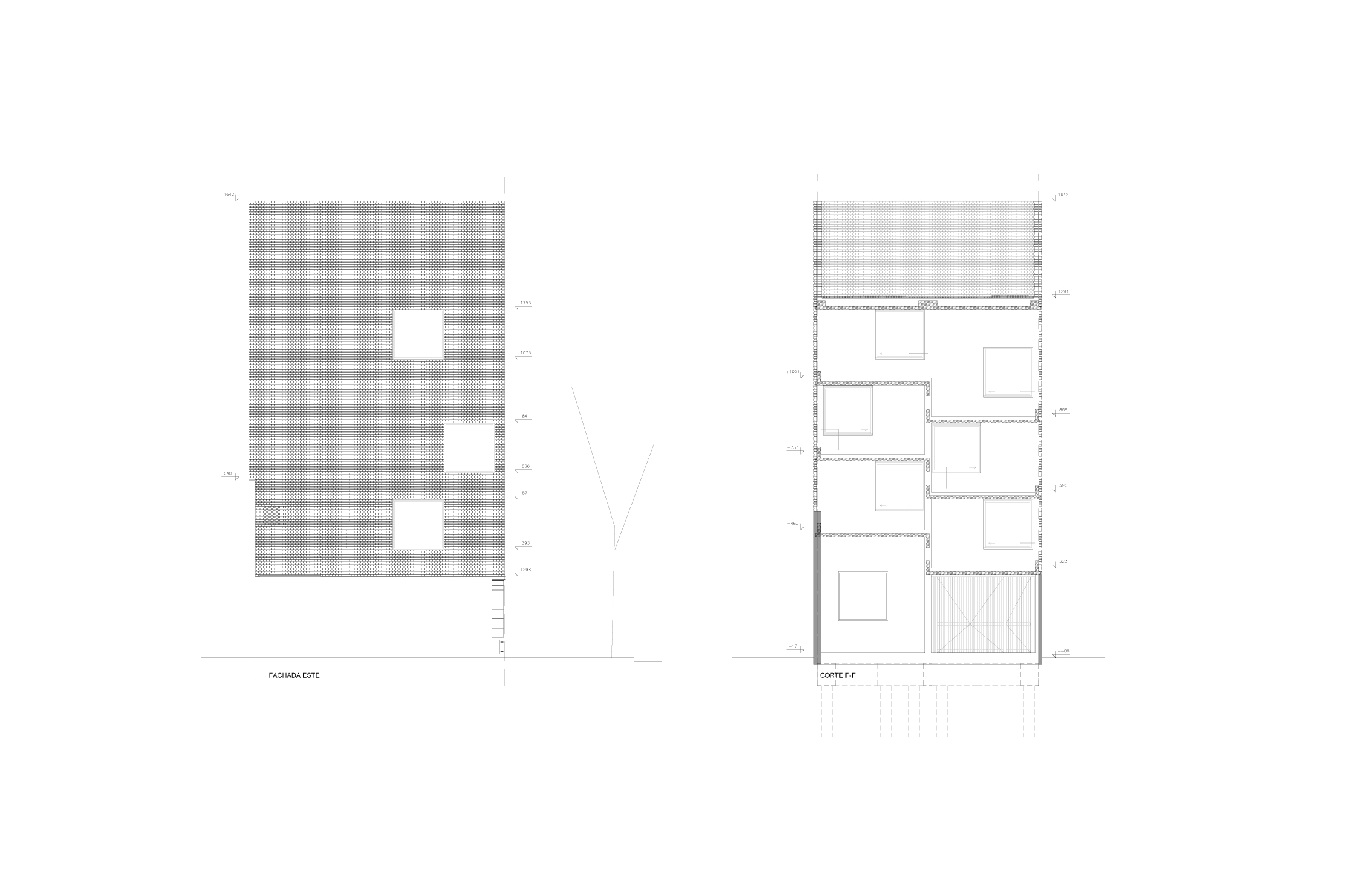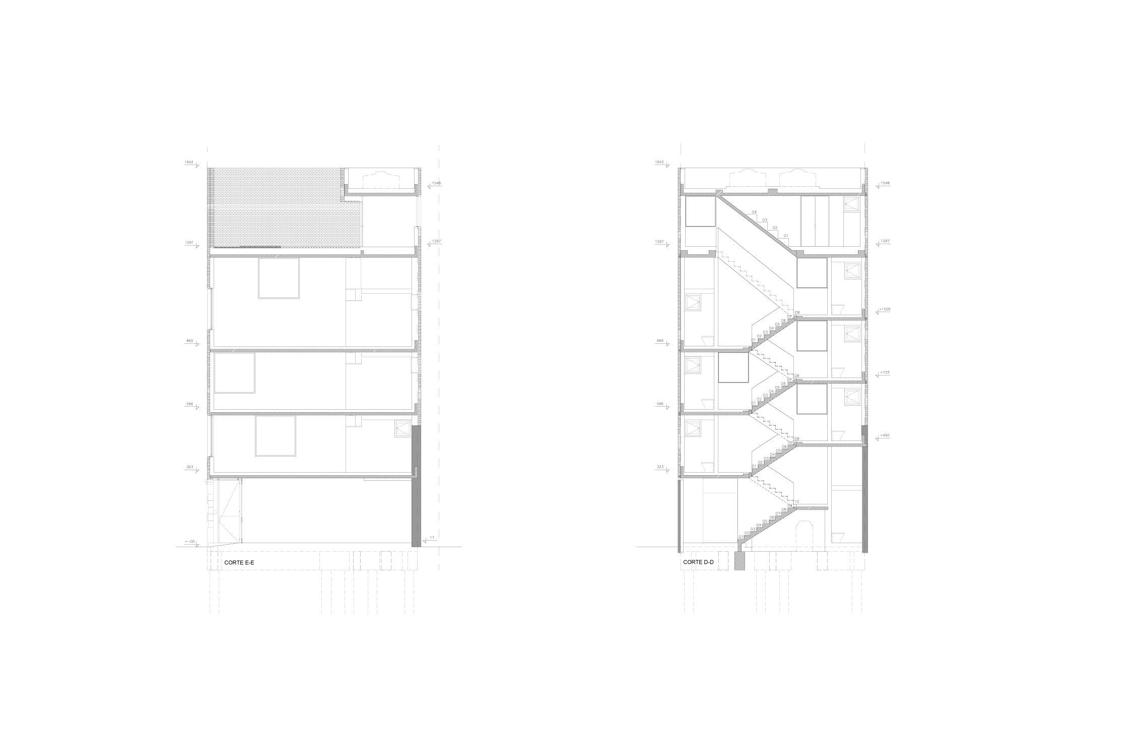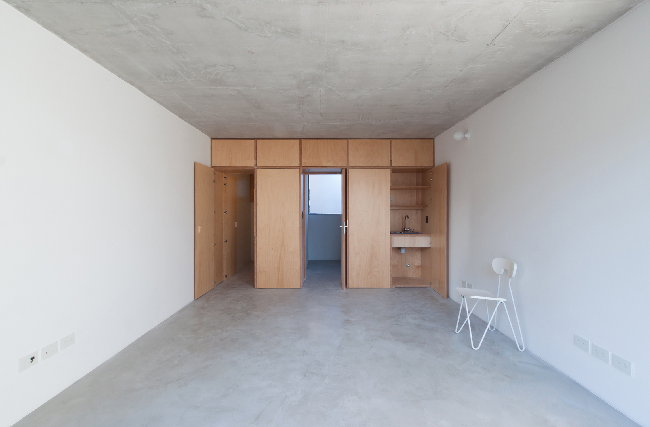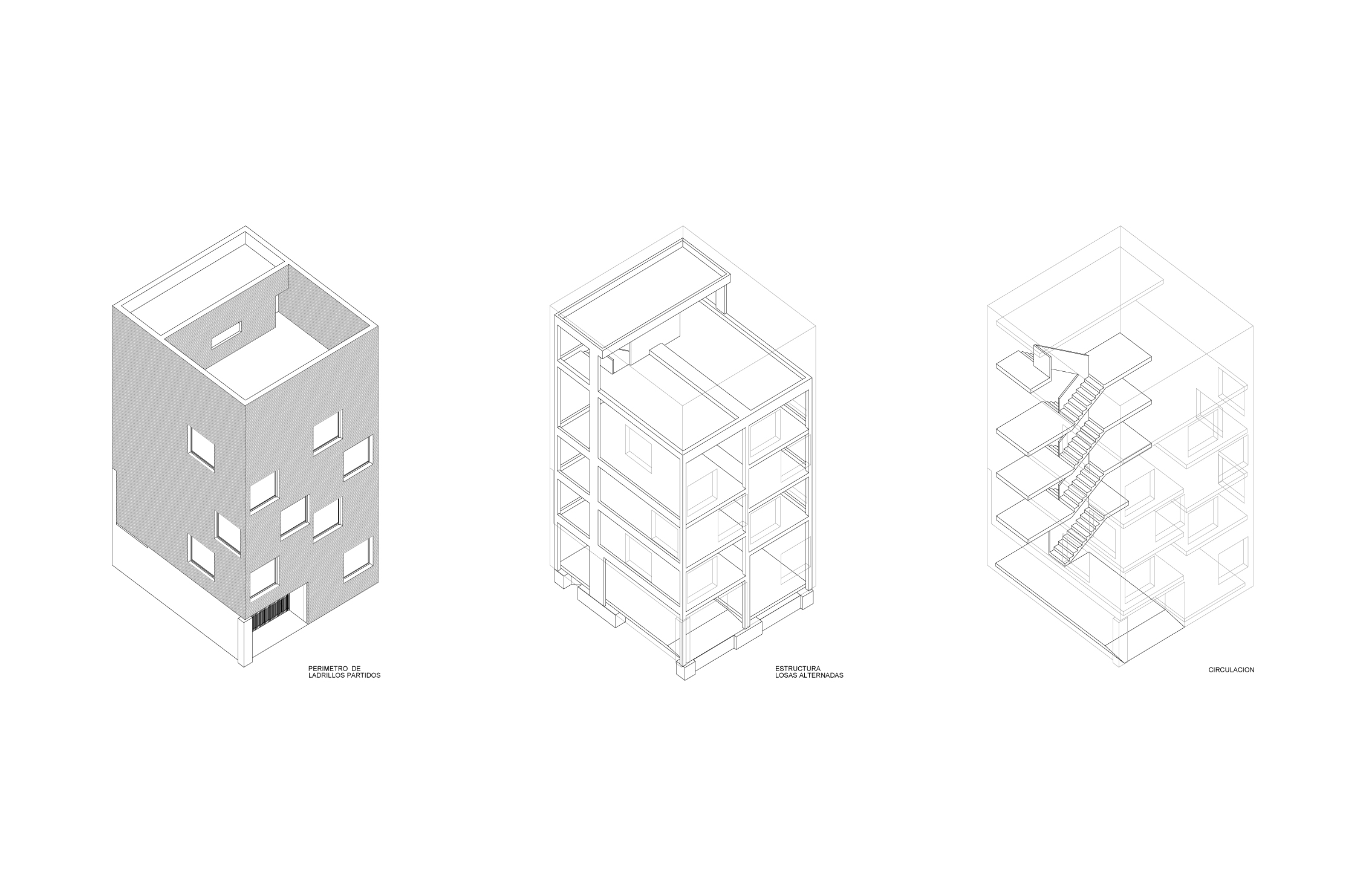 La extrusión vertical de un pequeño lote de 8 x 9 metros con orientación norte define el volumen del edificio. A partir de una división longitudinal interior en dos crujías iguales, se organizan siete unidades dispuestas en niveles apilados. La planta y el corte optimizan su relación y cada crujía se desplaza medio nivel verticalmente para utilizar los descansos de las escaleras como acceso a las unidades. El carácter y tamaño de los espacios habitables admite su uso tanto como vivienda mínima o lugar de trabajo, cada uno dotado de dos grandes ventanas, una para acceso de luz difusa desde las medianeras y otra para luz y ventilación sobre el frente. La piel exterior consta de ladrillos partidos a la mitad, exponiendo hacia afuera la textura interior del ladrillo, dejando ver su composición interna. Esto dota al volumen de una expresividad de colores entre anaranjados, negros y rojos, y una textura rugosa a la vez extraña y familiar. En la terraza los muros se elevan hasta definir un espacio abierto al cielo en donde una terraza jardín recupera las especies vegetales que crecían originalmente en éste fragmento de tierra.