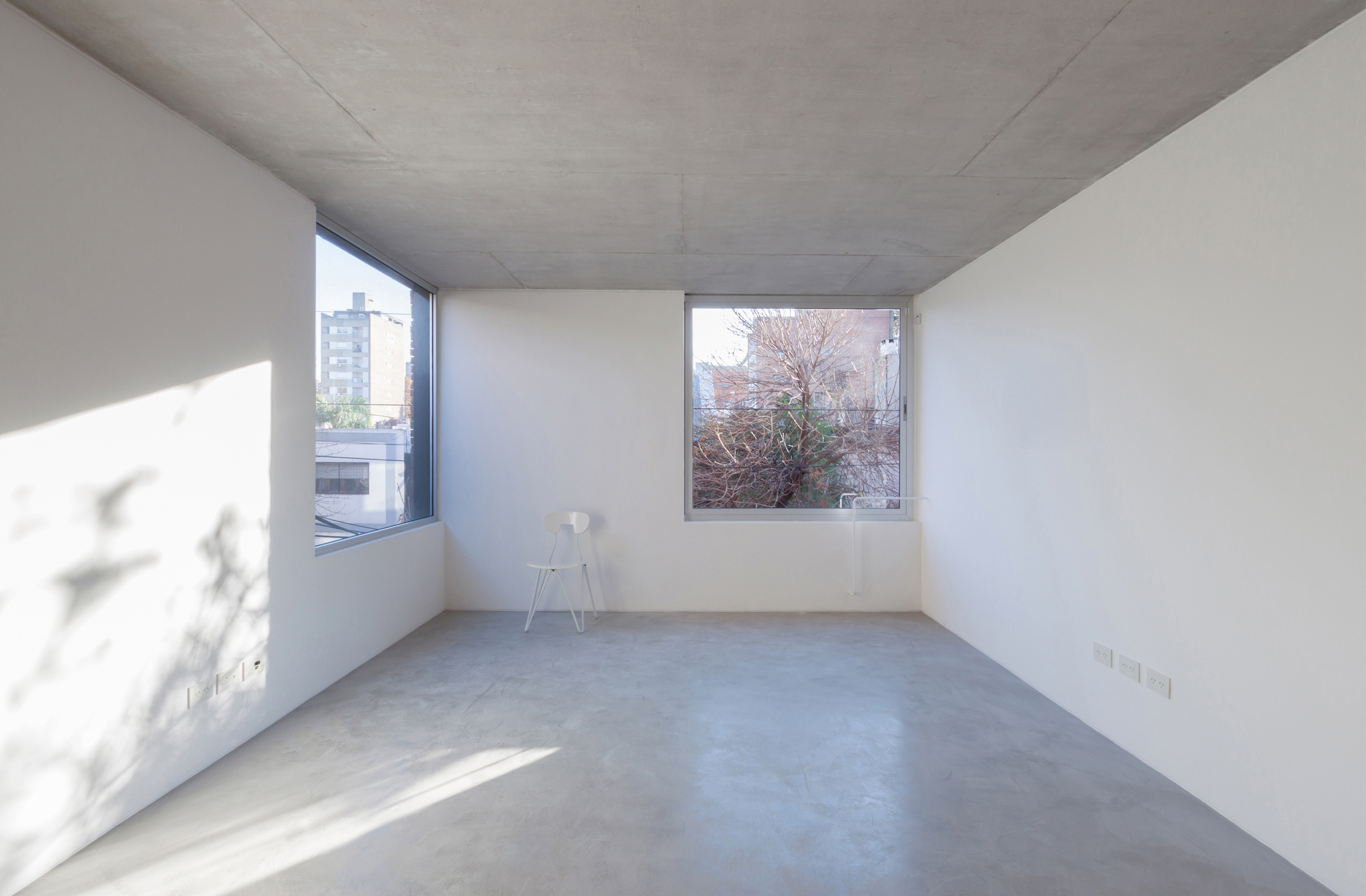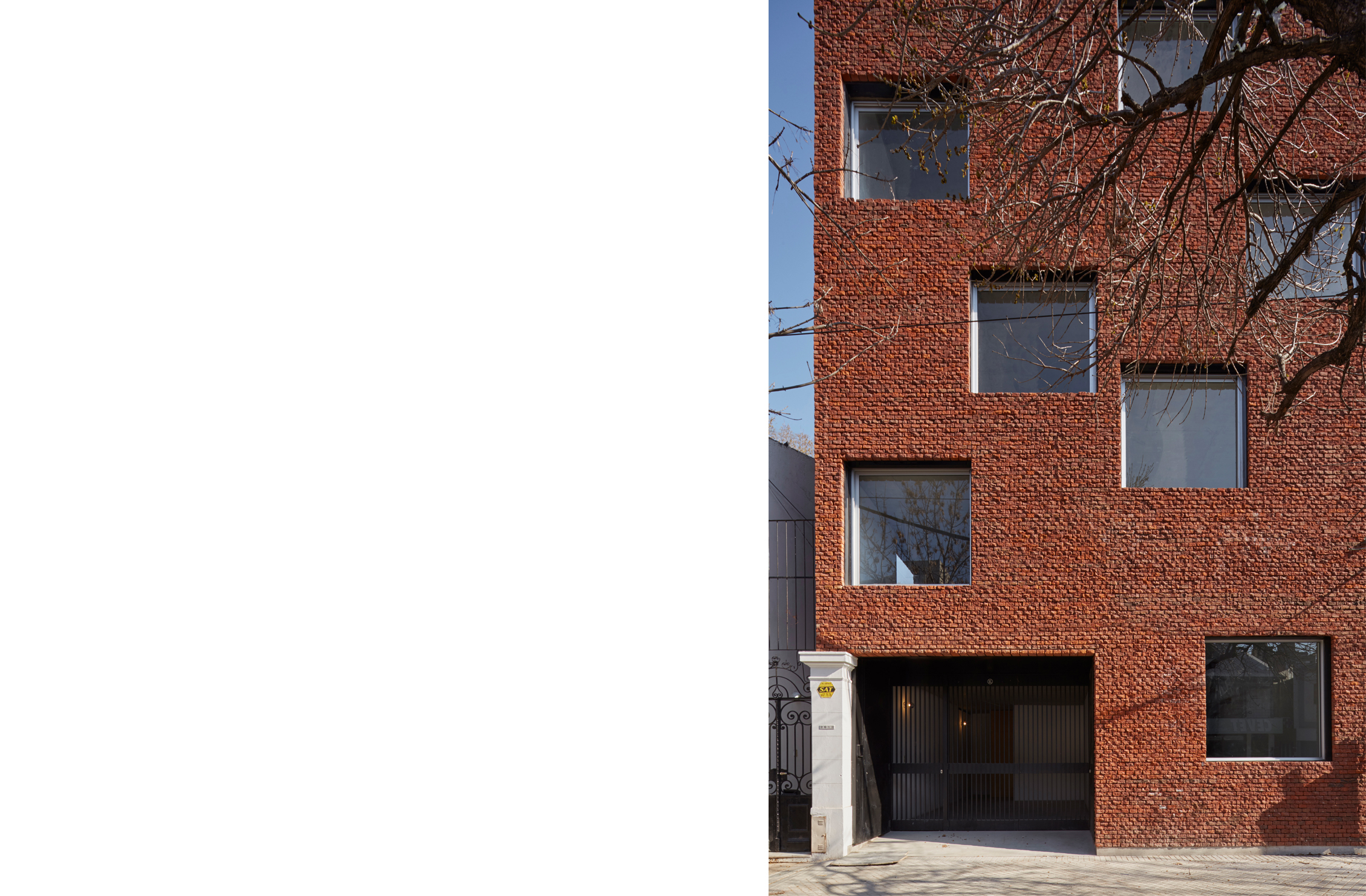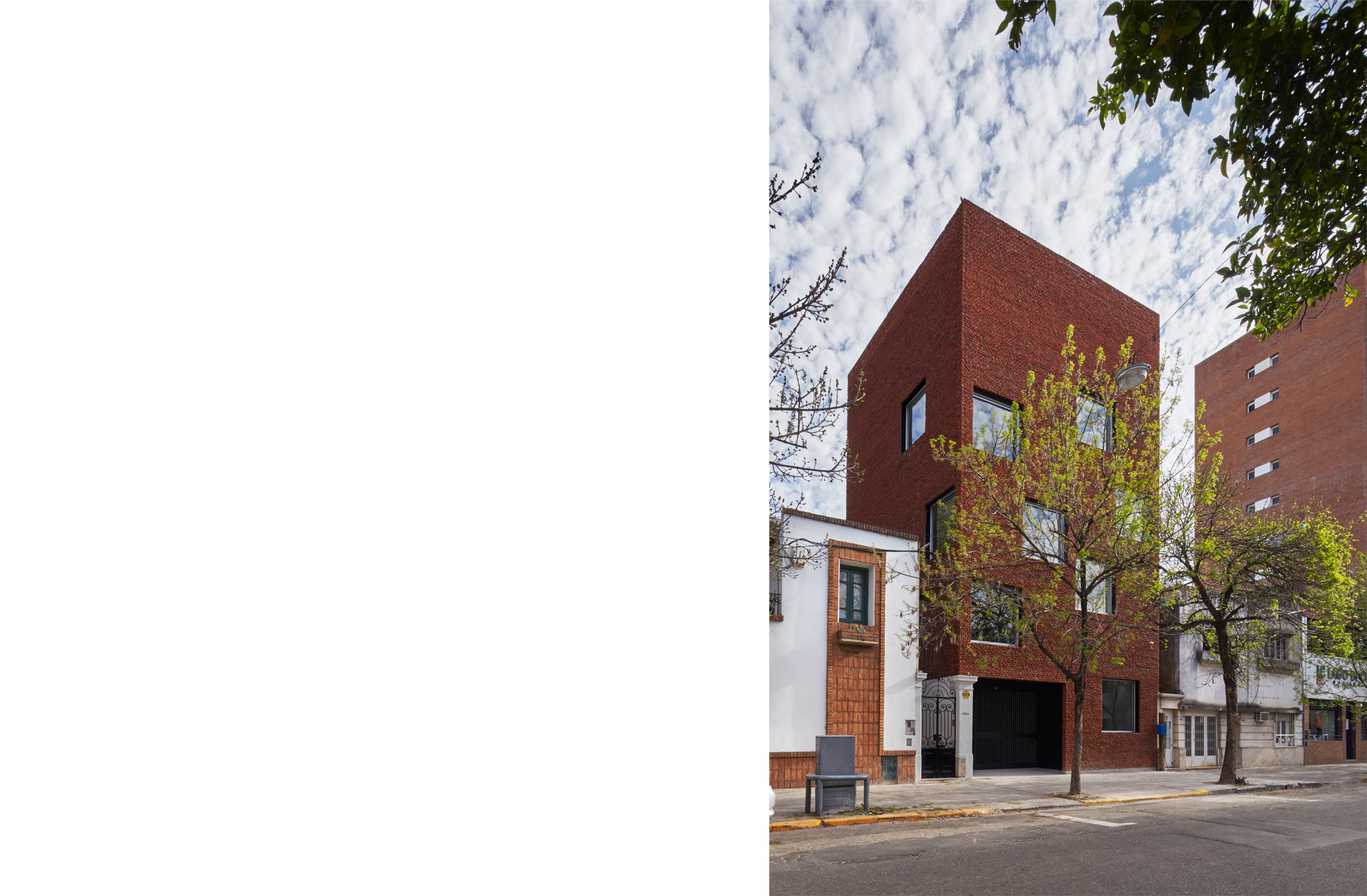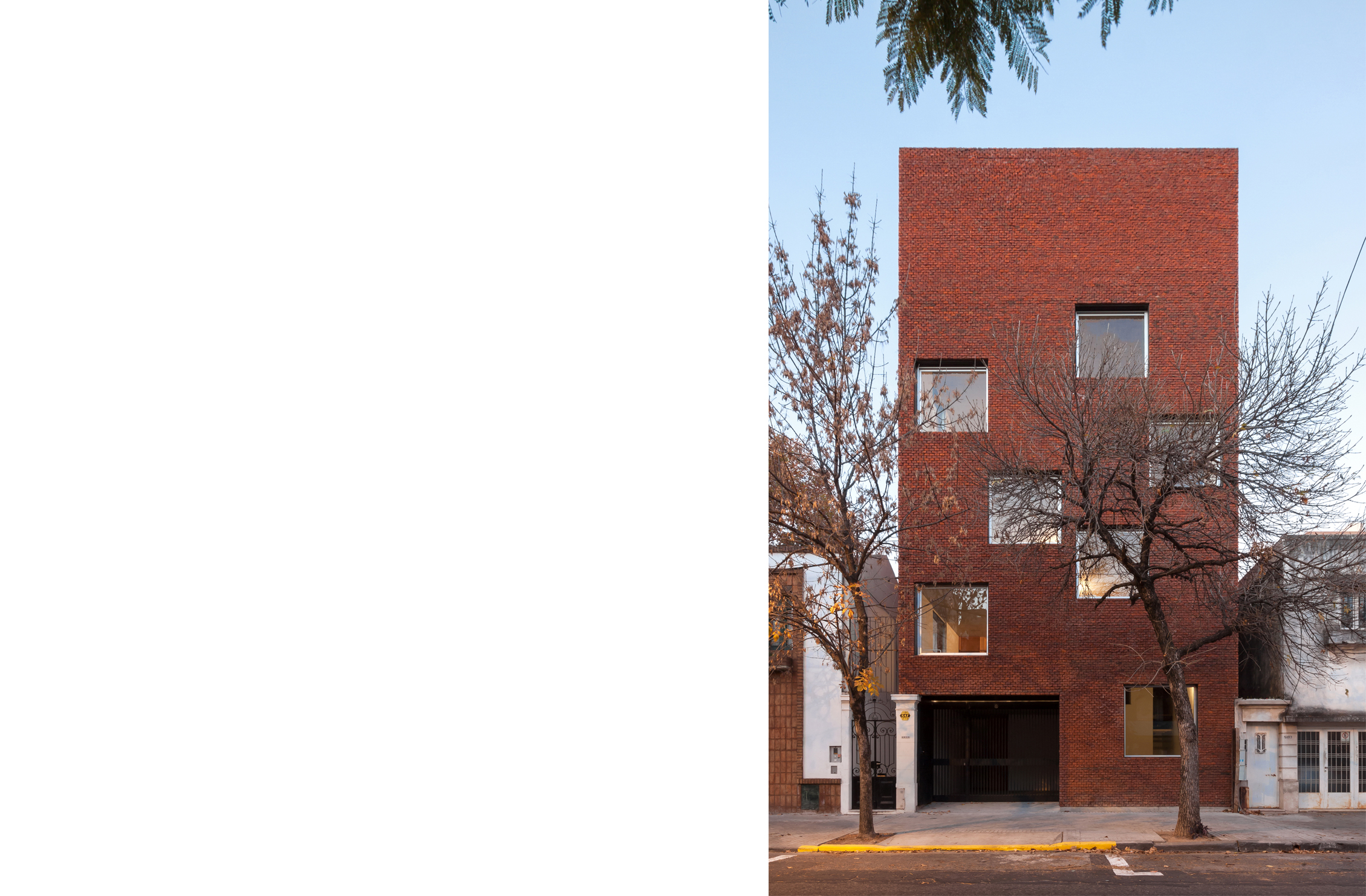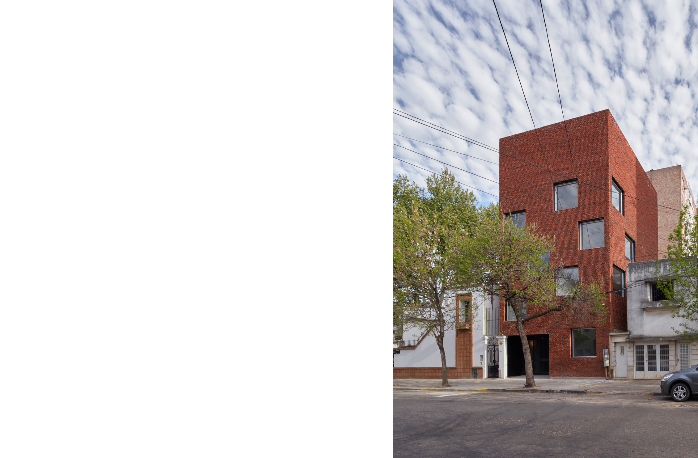 Ubicado en una zona cuya densidad edilicia está en aumento, el edificio ocupa un pequeño lote de 8×9 metros con orientación norte. La necesidad de optimizar los espacios dentro de las regulaciones urbanísticas vigentes determina una configuración en dos crujías longitudinales iguales, que organizan siete unidades dispuestas en niveles apilados. La planta y el corte optimizan su relación y cada crujía se desplaza medio nivel verticalmente para utilizar los descansos de las escaleras como acceso a las unidades. El carácter y tamaño de los espacios habitables admite su uso tanto como lugar de trabajo o vivienda mínima, cada uno dotado de dos grandes ventanas, una para acceso de luz difusa desde las medianeras y otra para luz y ventilación sobre el frente. La piel exterior consta de ladrillos partidos a la mitad, exponiendo hacia afuera la textura interior del ladrillo para dejar ver su composición interna. Esto dota al volumen de una expresividad de colores entre anaranjados, negros y rojos, y una textura rugosa e imperfecta a la vez extraña y familiar. En la terraza los muros se elevan y definen un espacio abierto al cielo en donde una terraza ajardinada recupera las especies vegetales propias de la región.