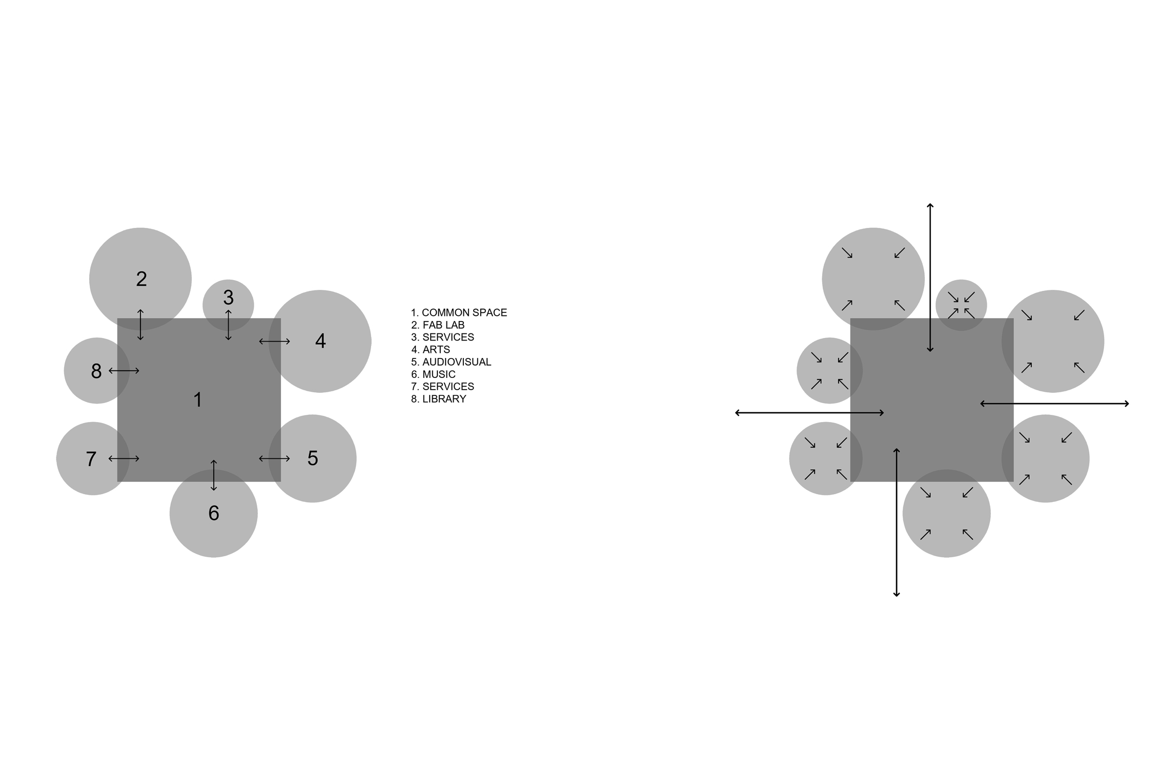 Este programa se tradujo en una disposición espacial que define el espacio común principal como un cuadrado central y varias aulas circulares de diferentes tamaños tangentes a su perímetro que alojan los espacios de aprendizaje específicos para Artes y Oficios, Música, Audiovisual, Biblioteca y un Fab Lab.