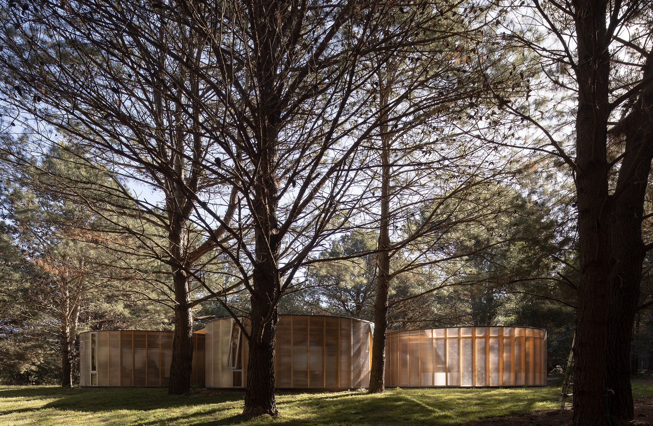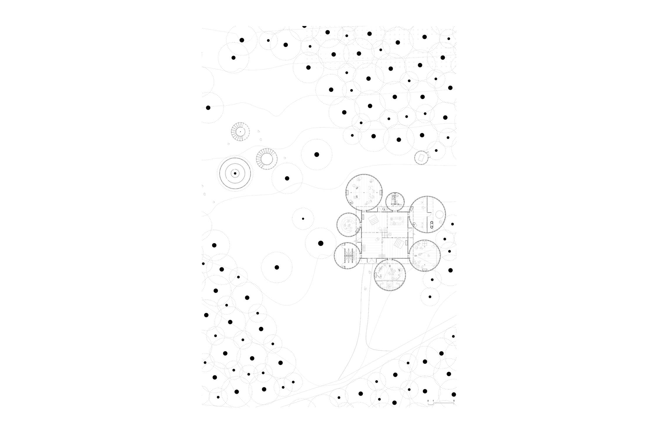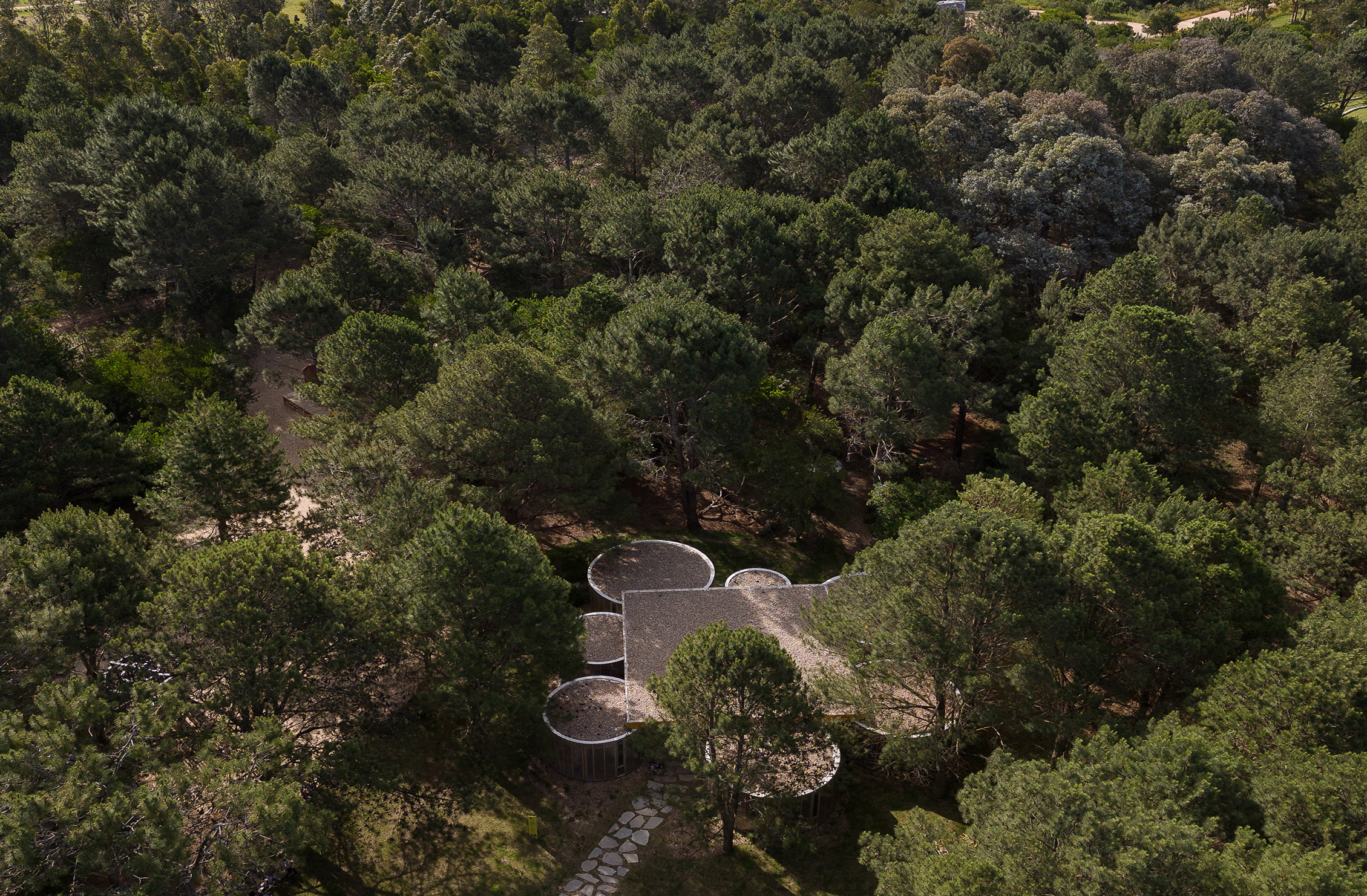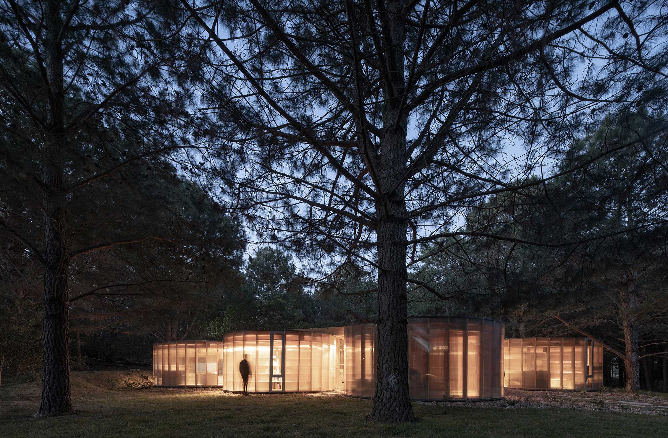 El sitio se caracteriza por ser un denso bosque de pinos y árboles vernáculos. Se seleccionó cuidadosamente un claro existente para la ubicación del proyecto. El edificio tiene un perímetro orgánico y se acomoda entre los árboles. La madera de reforestación es el principal material de construcción, lo que permitirá potencialmente desmantelar el edificio en el futuro.