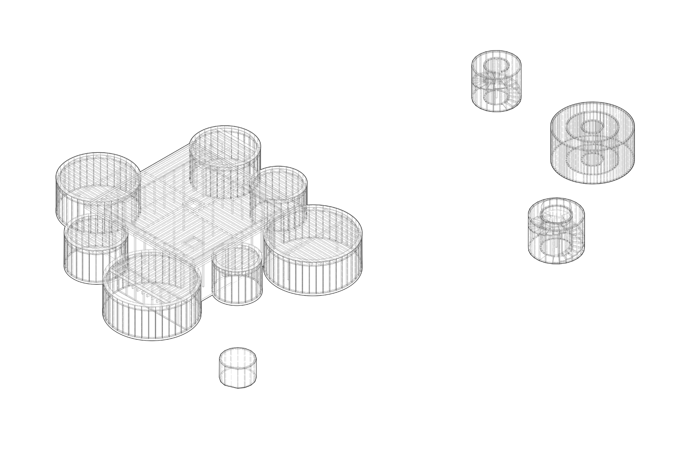 Las aulas circulares tienen una escala más pequeña, una piel translúcida y una cualidad más introvertida, fomentando la concentración y el enfoque. Se brindan al espacio cuadrado central, que es más alto, espacialmente flexible y tiene un perímetro abierto transparente que le permite relacionarse con el bosque a través de los espacios intersticiales entre las aulas.