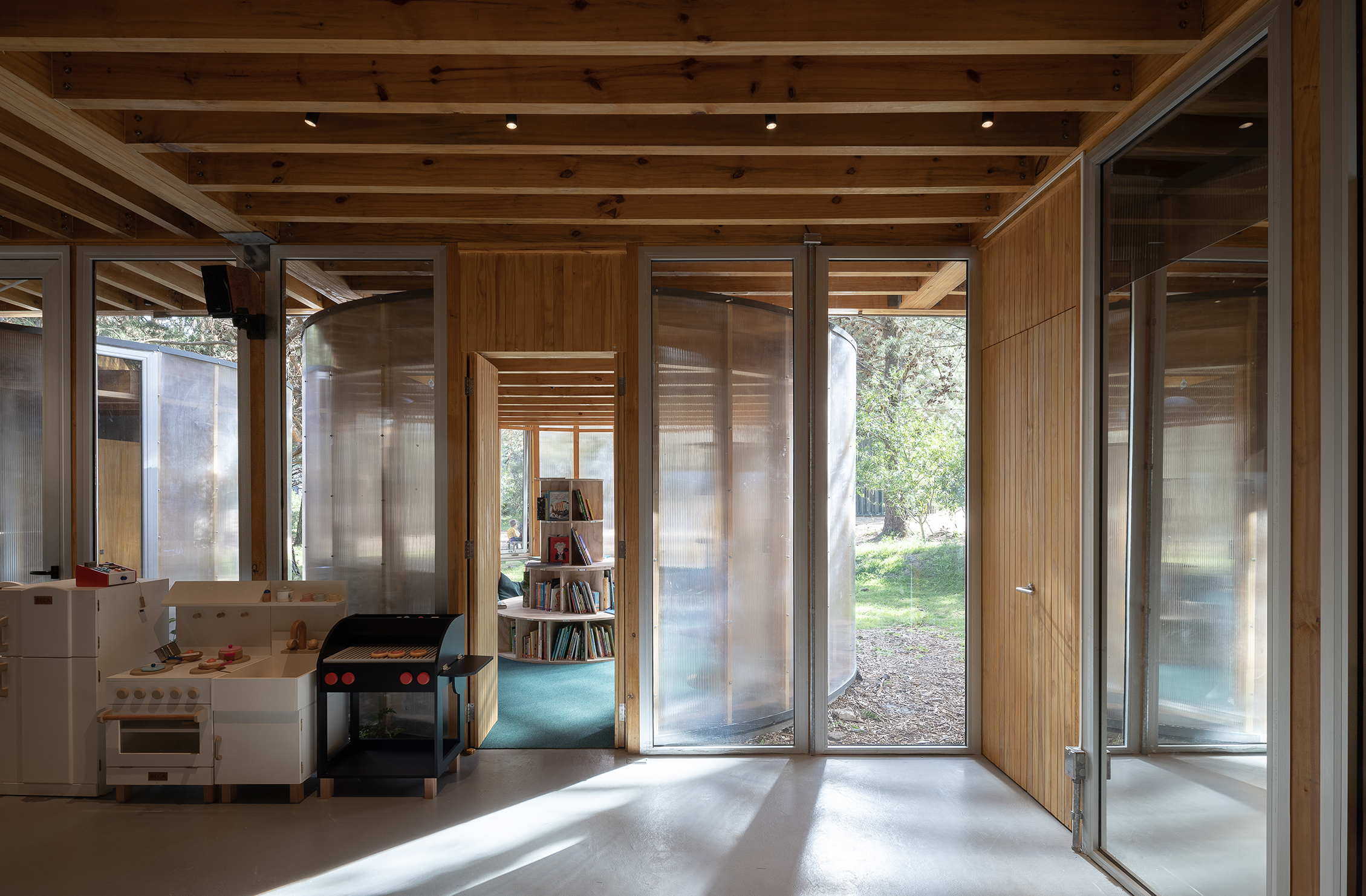 El bosque es el primer espacio de aprendizaje, y la forma en que el edificio se integra con él en una relación respetuosa y enriquecedora entre naturaleza y hábitat humano. Se requerían una serie de salas de aprendizaje específicas y de menor escala para distintos grupos de niños y actividades, más un espacio grande y versátil destinado a ser un área común para la integración, exhibición y socialización.