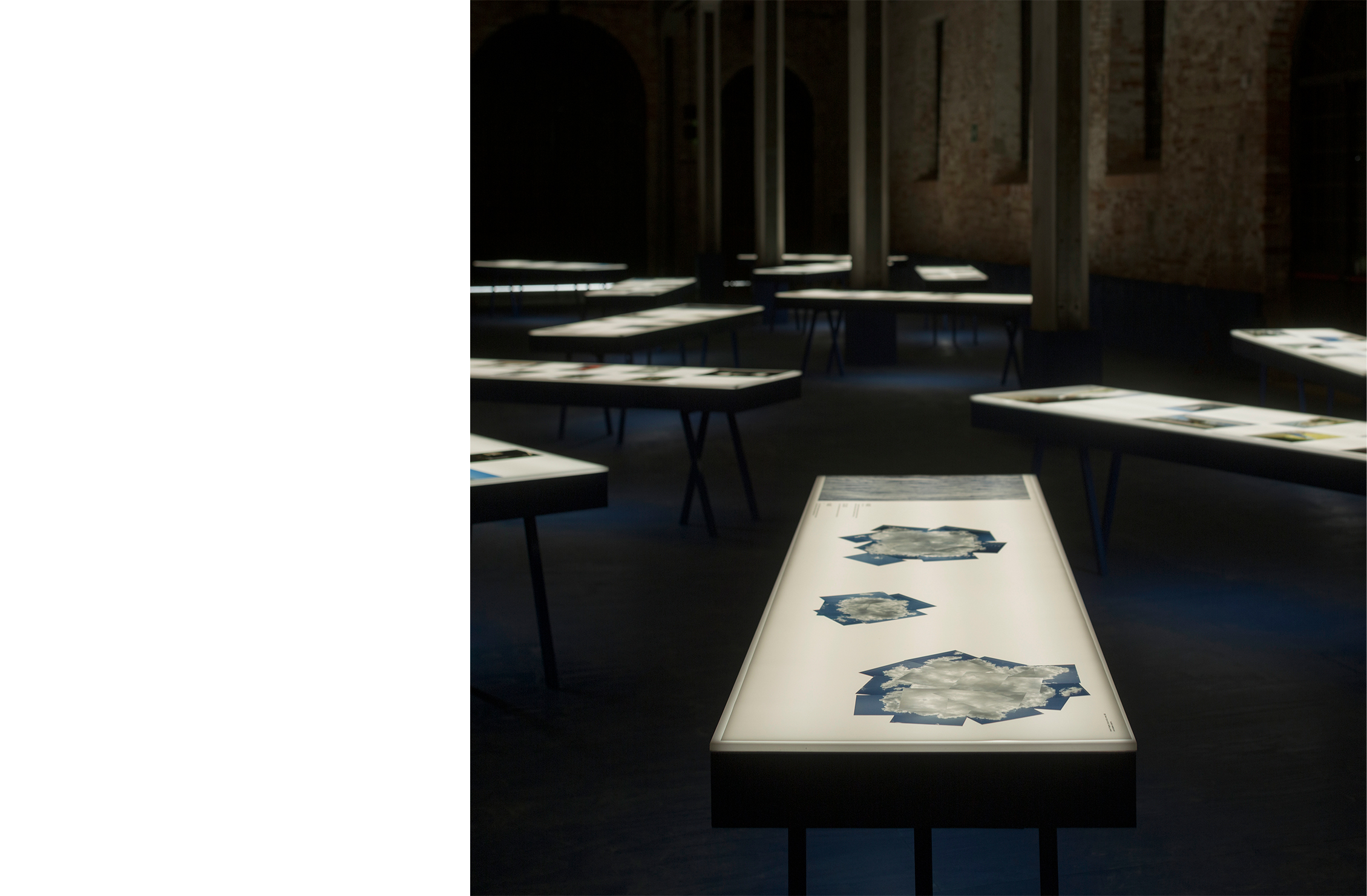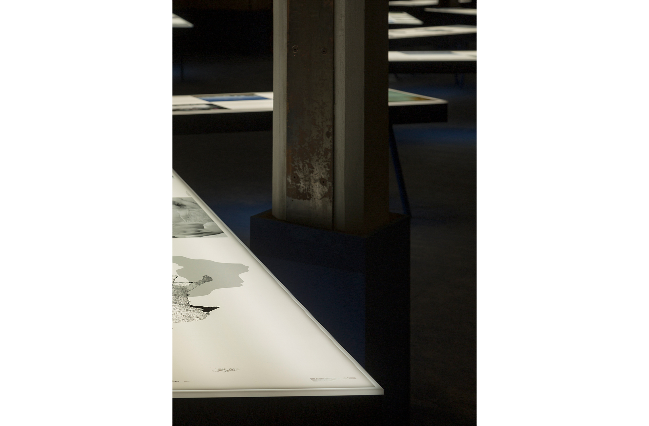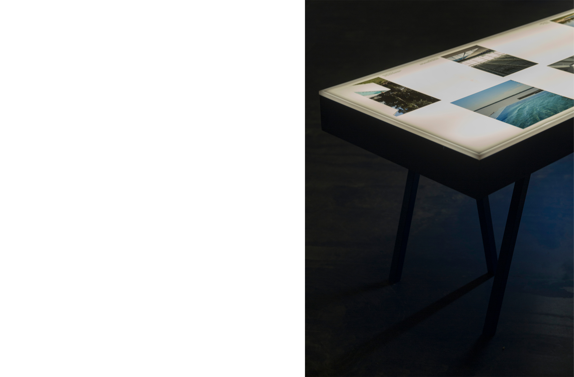 Sobre este líquido intangible unos planos blancos de luz se disponen libremente, con el desorden propio de las cosas que flotan. Estos planos son la parte superior de grandes mesas de luz como las que se encuentran en los laboratorios fotográficos o como mesas de calcado. Sobre ellos, filminas con imágenes agrupadas por tema presentan la exhibición. La luz difusa que baña el espacio acentúa la ilusión líquida del lugar.