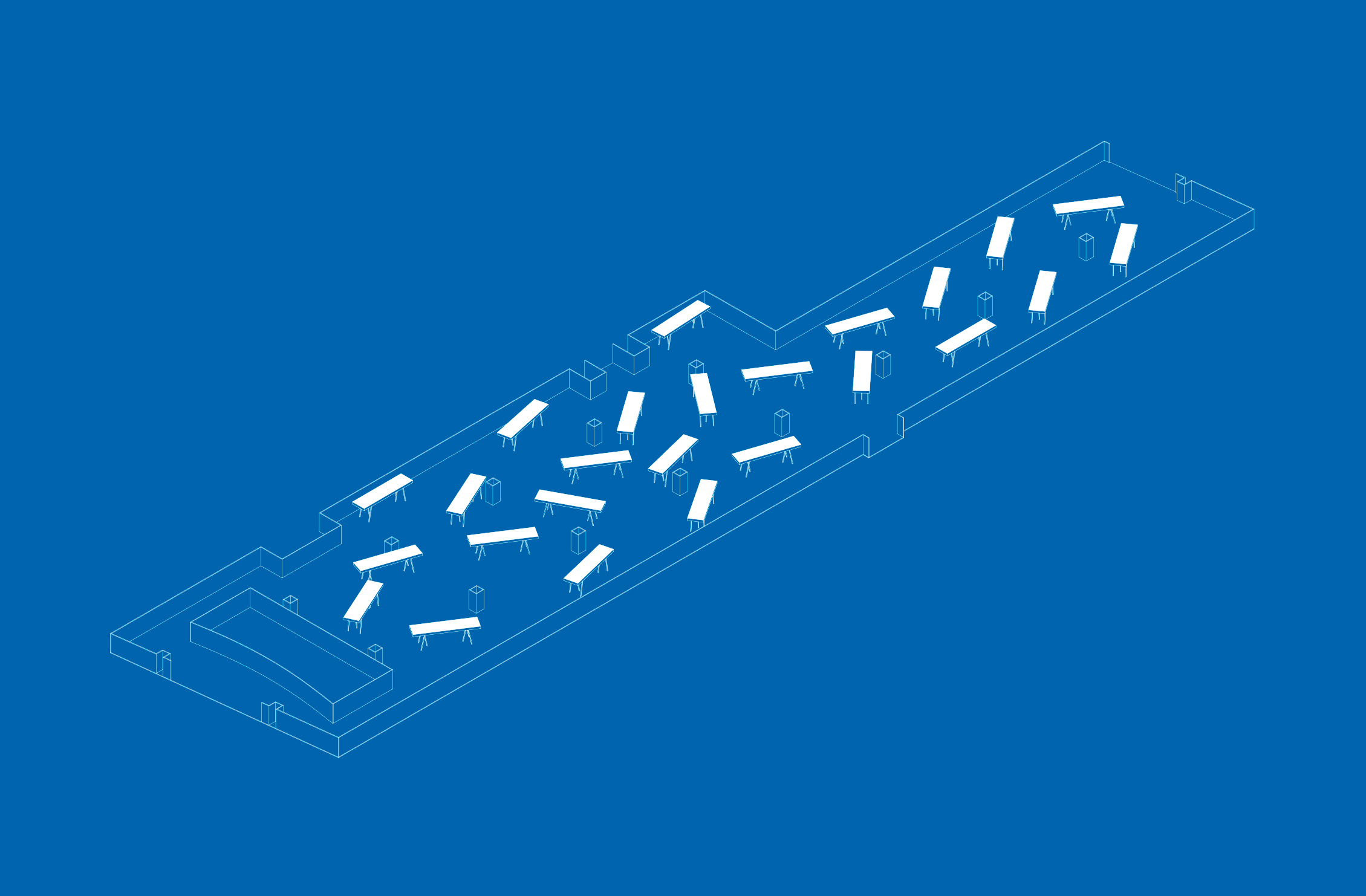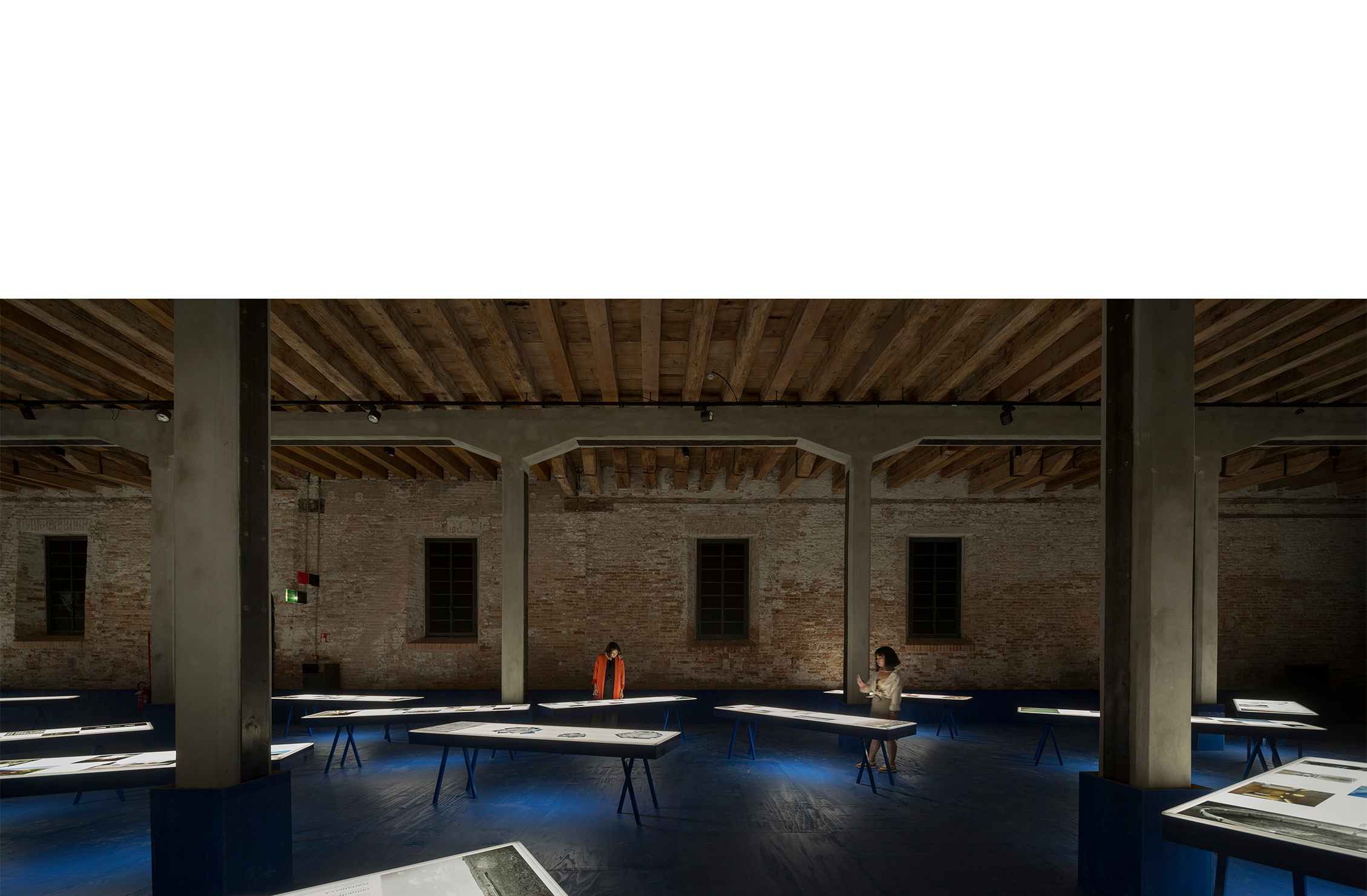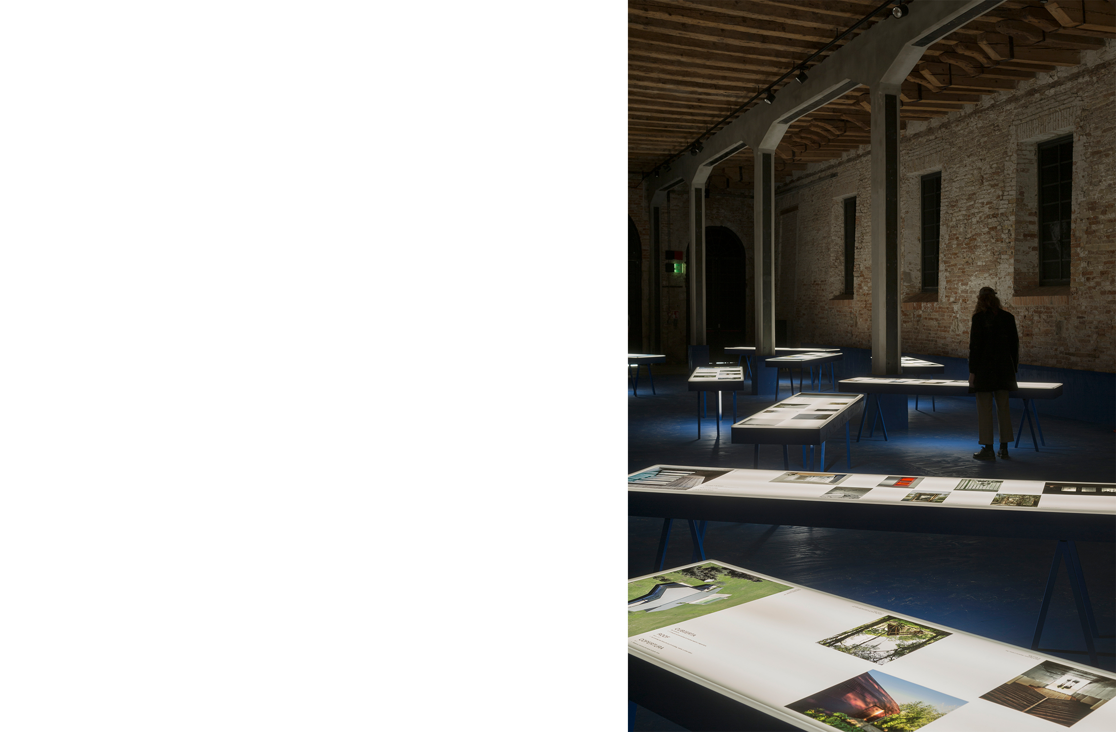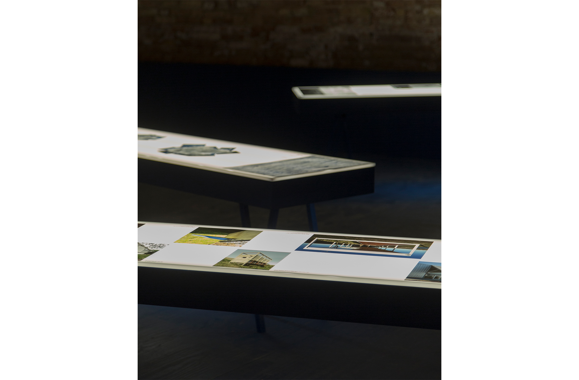 Sobre este líquido intangible unos planos blancos de luz se disponen libremente, con el desorden propio de las cosas que flotan. Estos planos son la parte superior de grandes mesas de luz como las que se encuentran en los laboratorios fotográficos o como mesas de calcado. Sobre ellos, filminas con imágenes agrupadas por tema presentan la exhibición. La luz difusa que baña el espacio acentúa la ilusión líquida del lugar.